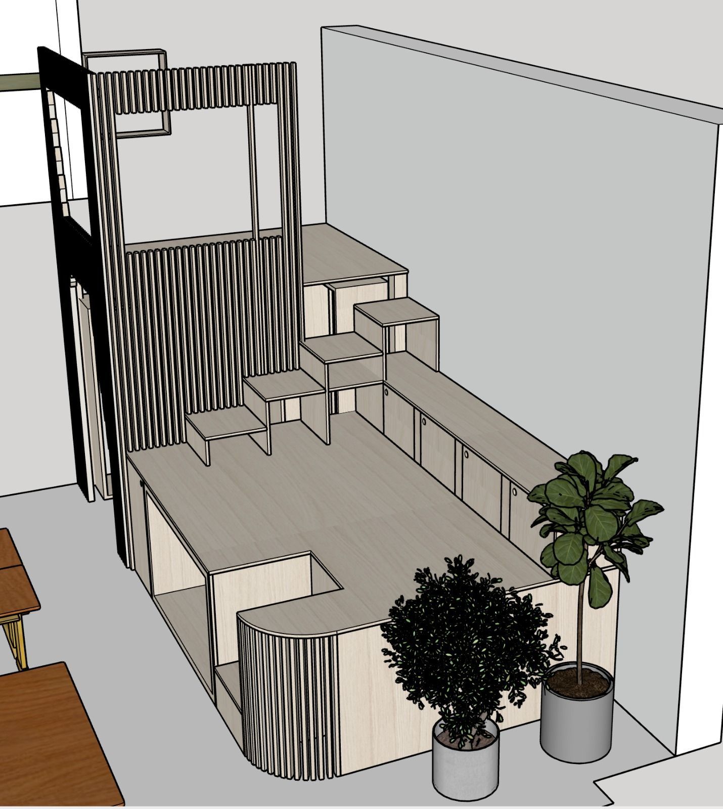 kleines gemütliches zimmer mit hochebene, spielpodest, treppenregal und stauraum