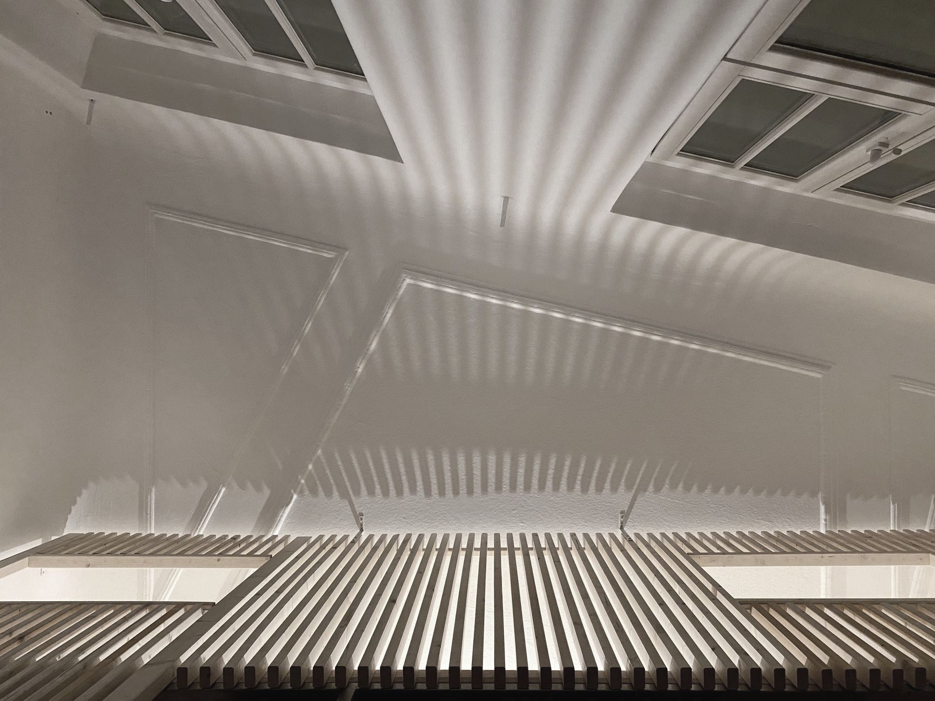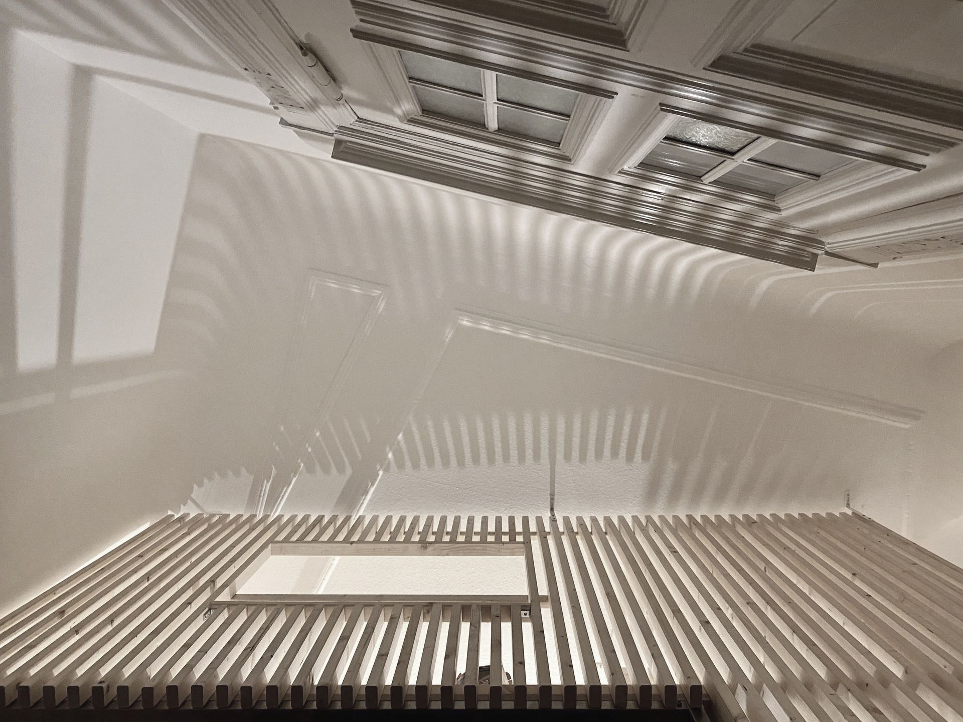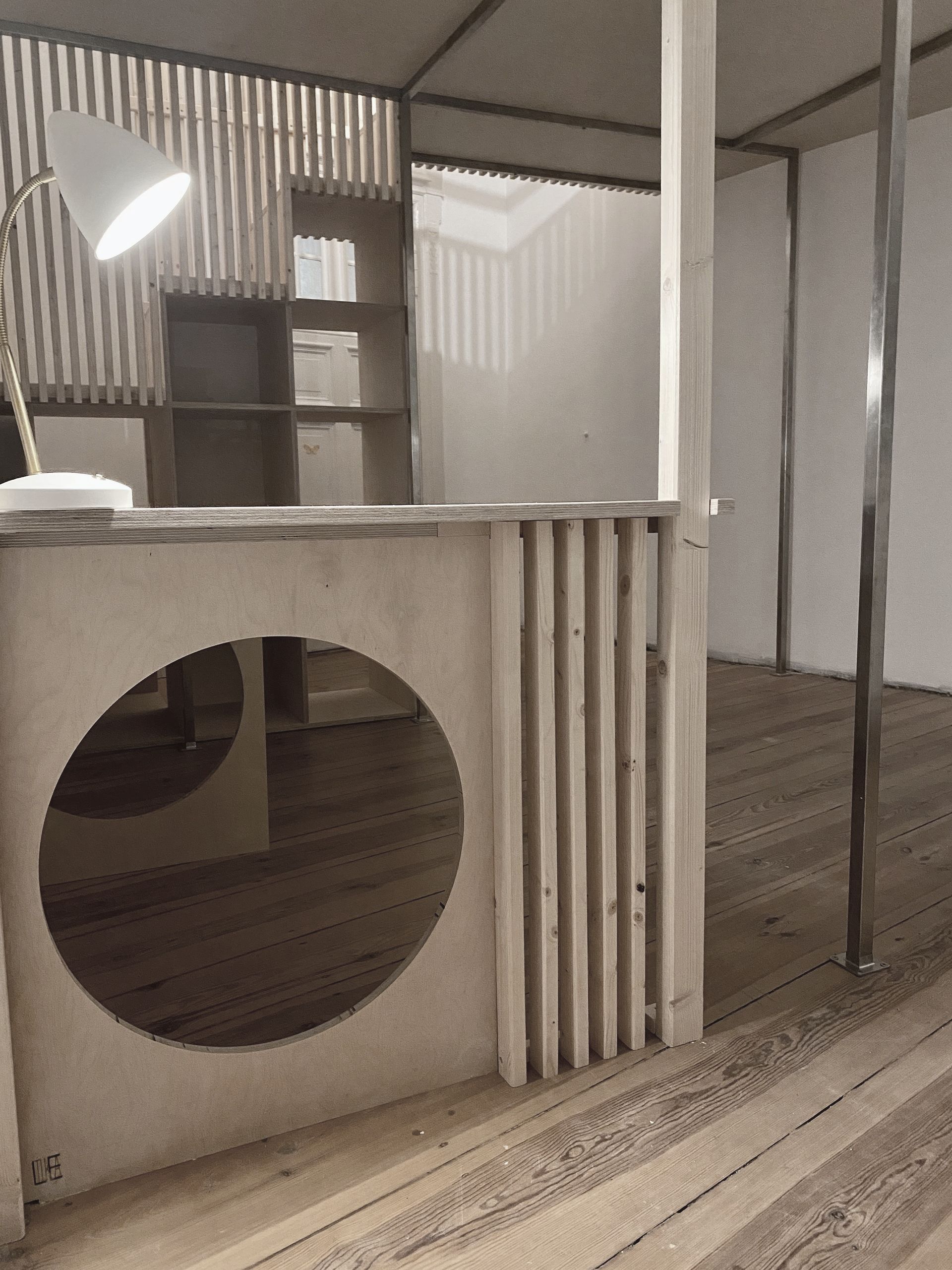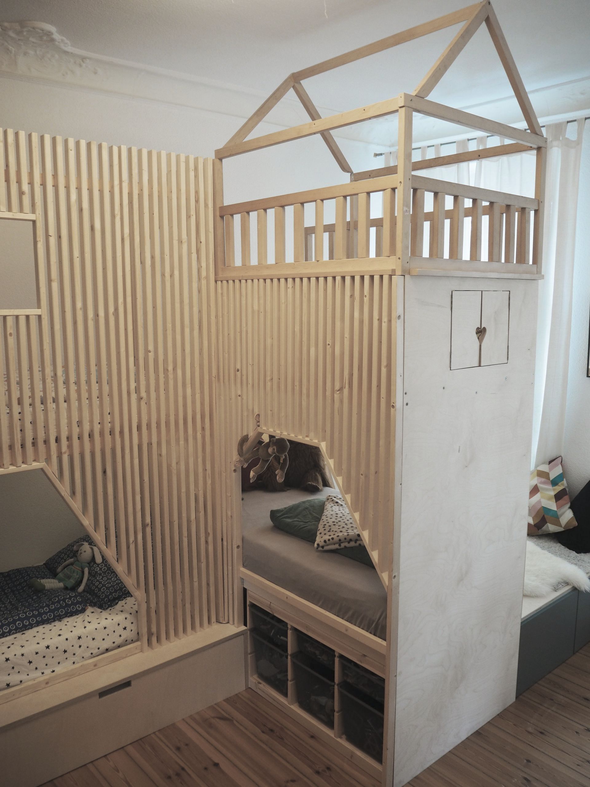 schattenspiel, hochebene mit bett für 2 kinder, spielebene, integrierter stauraum und schreibtischen.