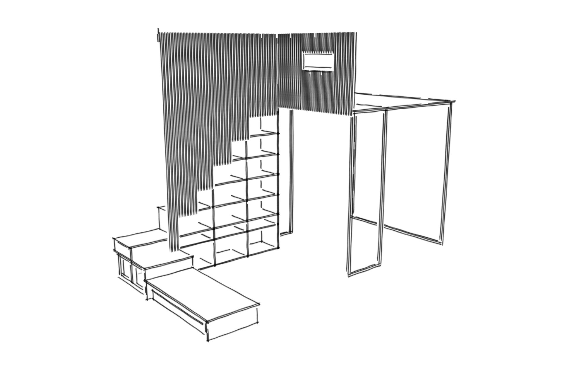 Hochebene mit Bett für 1 Kinder, mit integriertem Stauraum.